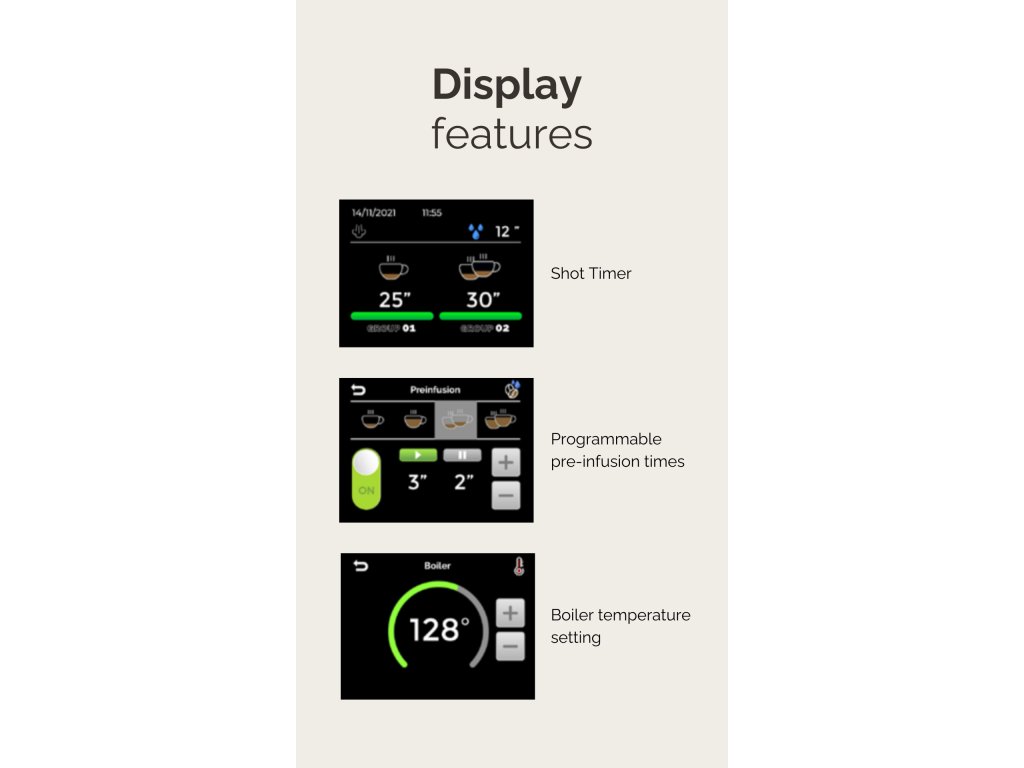 | Volitelné | Zvýšené hlavy pro vysoké kelímky • Aktivní nahřívač hrnků • portafiltery a knoflíky páry z olivového dřeva |