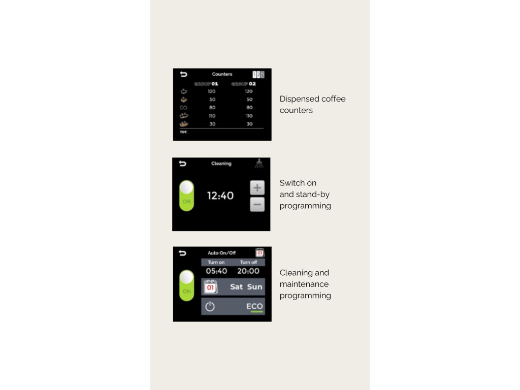 - Dotykový displej = rychlé nastavení teplot skupin i boileru.