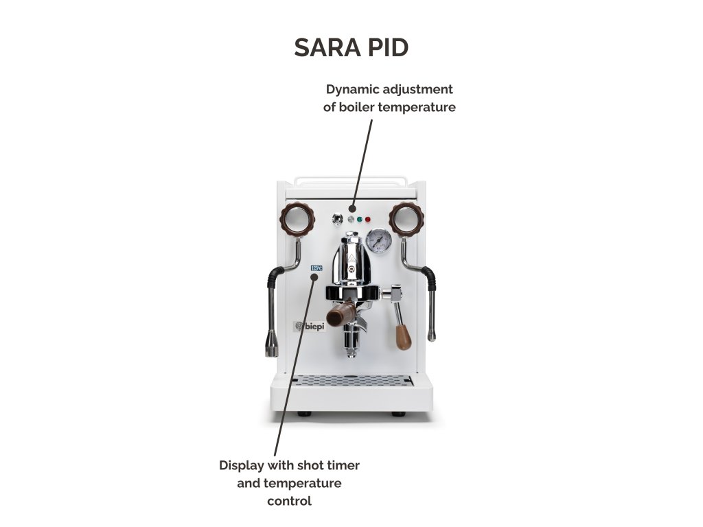 BIEPI SARA je poloprofesionální pákový kávovar navržený a vyrobený v Itálii, ideální pro domácnosti a menší kavárny. S profesionální hlavou E61 a volitelnou PID regulací teploty nabízí precizní extrakci kávy, zatímco jeho elegantní bílý design (Total White) z něj činí stylový doplněk každé kuchyně.