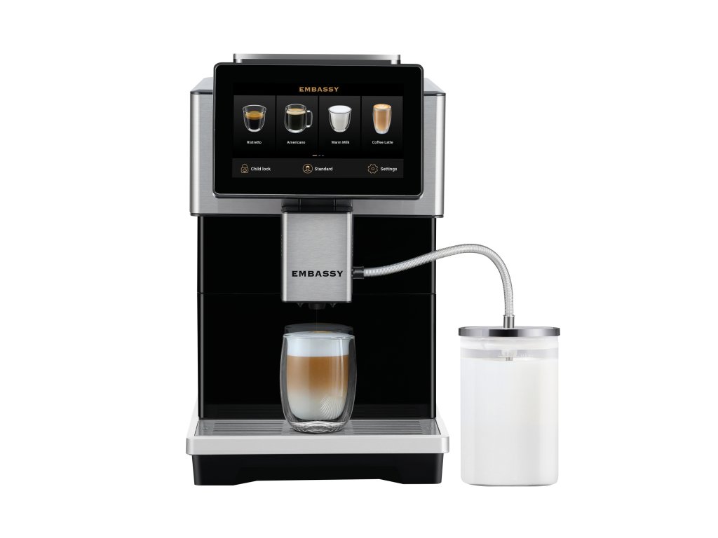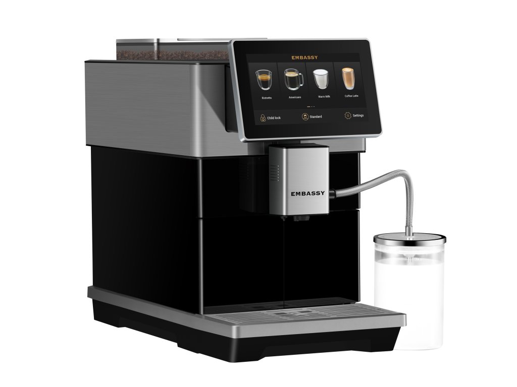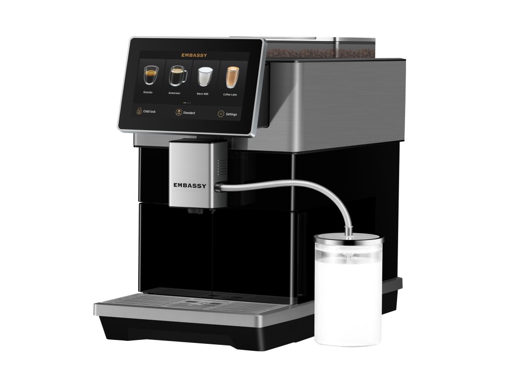 Poloprofesionální kávovar pro přípravu 20 káv denně. Kávovar přichází se skleněnou karafou a mléčnou hadičkou v kovovém obalu.